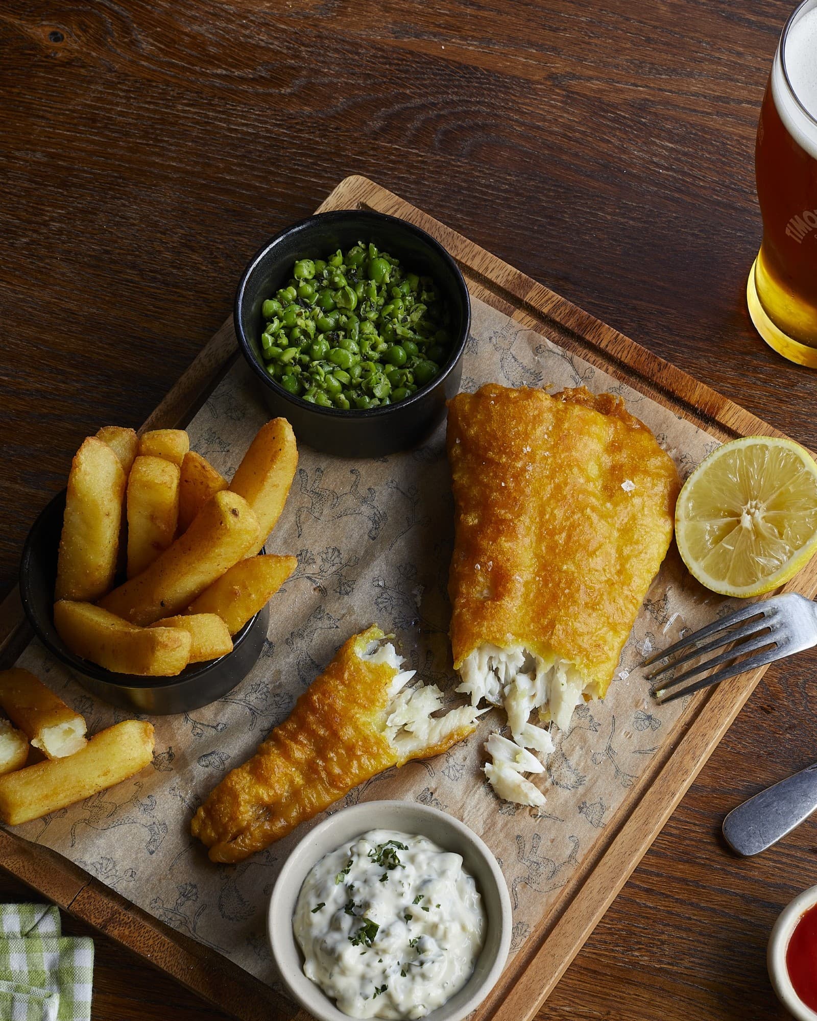 Our beer-battered haddock is golden, crisp and cooked with care, served with crushed minted peas, chips and tartare sauce.